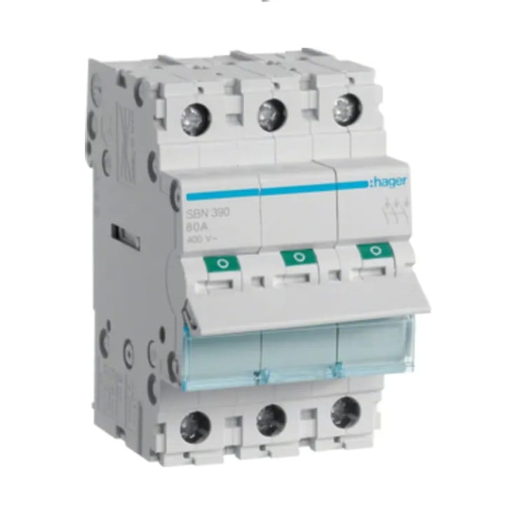 Elke modulaire isolatieschakelaar van HAGER heeft groene en rode velden op de bedieningshendel om de positie van de schakelaar duidelijk zichtbaar te maken. Het SBN390-apparaat is gemaakt van duurzaam kunststof en is geschikt voor temperaturen van -20ºC tot +50ºC.