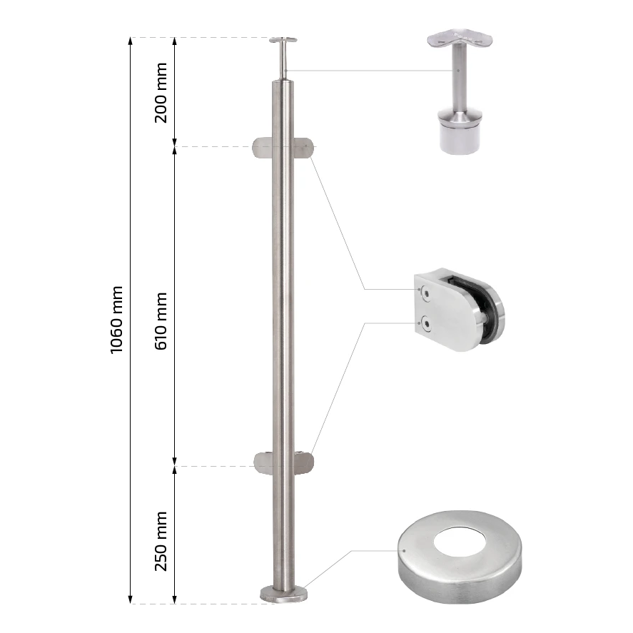 Hoekpaal voor balustrade van roestvrij staal AISI 304 met satijn afwerking — kant-en-klaar element voor de bouw van professionele glazen balustraden. Uitgerust met 4 bevestigingen voor glas van 40×50 mm, geschikt voor glasplaten met dikte van 6 tot 10,76 mm. Universele constructie geschikt voor zowel balkon- als trapbalustraden.