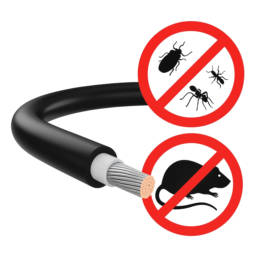 Waarom is AR-bescherming belangrijk? Kabelschade door knaagdieren is een van de meest voorkomende oorzaken van storingen in PV-installaties, vooral in landelijke gebieden en nabij bedrijfsgebouwen. Het knaagdierwerend middel in de buitenmantel weert effectief ongedierte en elimineert het risico op kostbare stilstand en reparaties.
