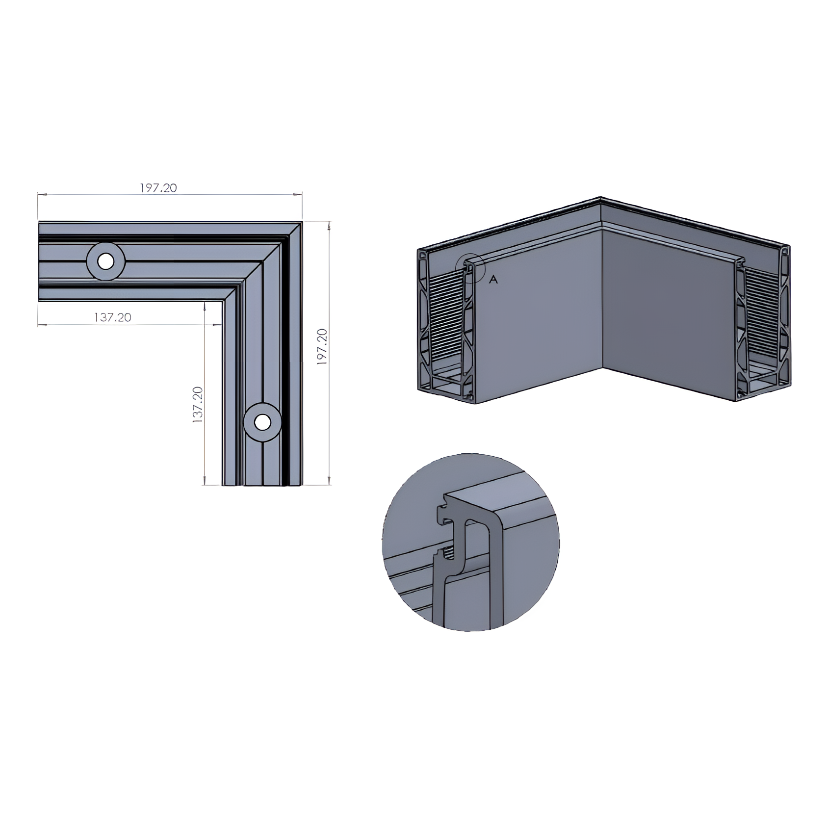 - Geometrie 197 × 197 mm — symmetrische hoekproporties elimineren de noodzaak om glaspanelen bij te snijden en zorgen voor optimaal verankeringsoppervlak