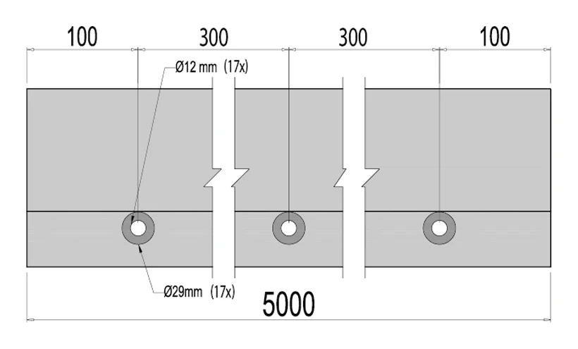 Het profiel heeft fabrieksmatig uitgevoerde 17 bevestigingsgaten die gelijkmatig verdeeld zijn over de volledige lengte van 5000 mm. De gatafstand bedraagt 300 mm, en de afstand van de profielrand tot de as van het eerste en laatste gat — 100 mm. Elk gat heeft een diameter van Ø12 mm met verdieping Ø29 mm, wat montage met schroeven met conische kop mogelijk maakt. De precieze gatverdeling versnelt de installatie aanzienlijk — er hoeft niet ter plaatse geboord te worden.