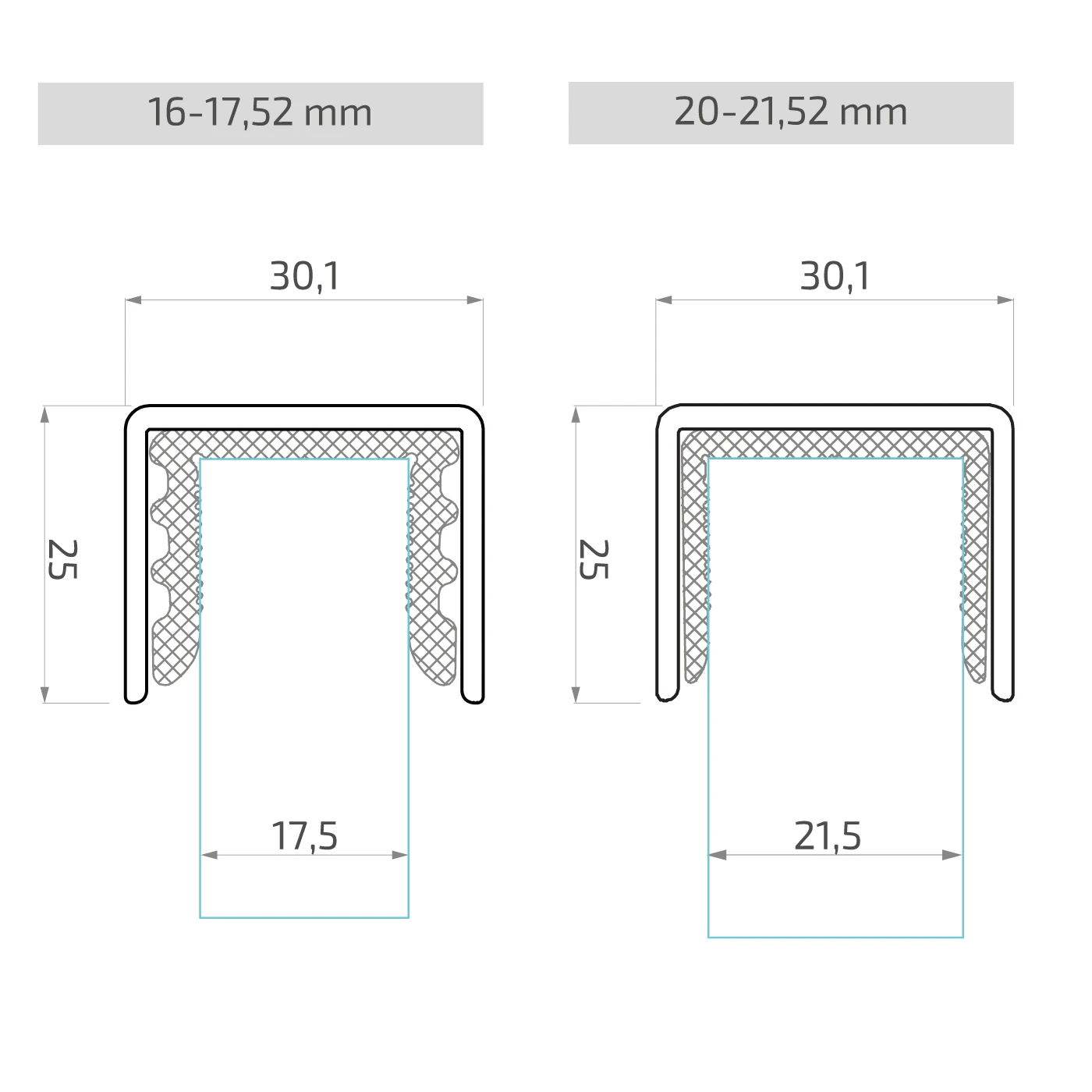 - Buitenafmetingen profiel: 30,1 × 25 mm