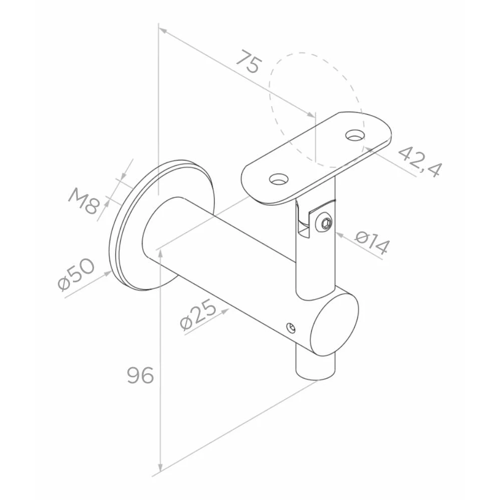 De houder kenmerkt zich door een solide constructie en hoge esthetiek van de afwerking in satijn (borsteling). Het scharnier zadel maakt een vloeiende regeling van de leuninghoek mogelijk, wat de montage op traptreden met verschillende hellingen aanzienlijk versnelt. De montagerozet met diameter Ø50 mm maskeert het verankeringspunt esthetisch, en de schroefdraad M8 zorgt voor een betrouwbare bevestiging aan de wand. Dit element is een van de meest intensief gebruikte elementen van de balustrade — daarom is het gemaakt van hoogwaardige roestvrije staal die jarenlange duurzaamheid en corrosiebestendigheid garandeert.