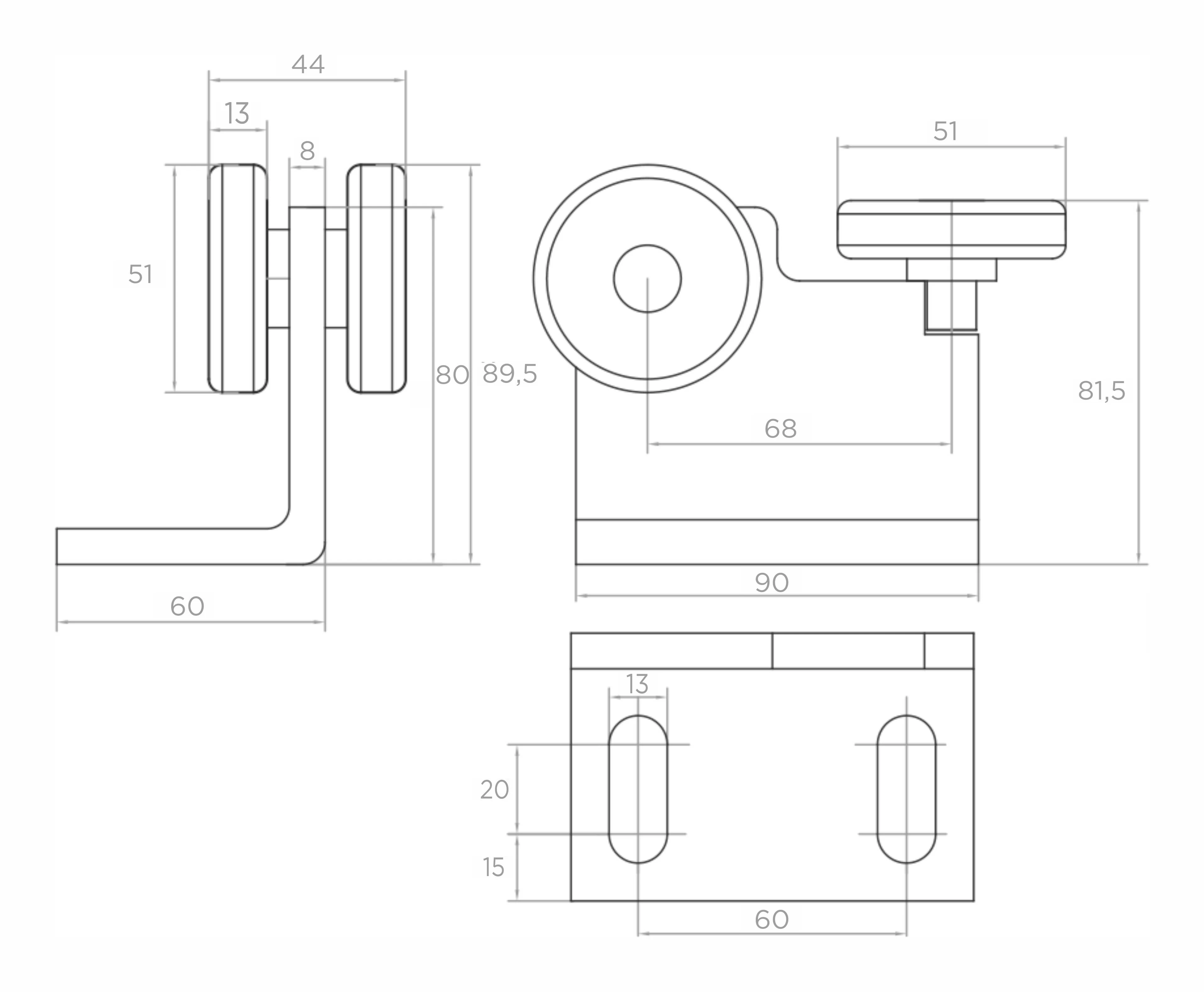 De loopwagen bestaat uit drie wielen met een diameter van 51 mm — twee verticale stalen wielen geleiden de poort langs de onderste flens van het draagprofiel, terwijl het derde wiel van kunststof, horizontaal geplaatst, het poortvleugel zijdelings stabiliseert en zijdelingse afwijkingen en trillingen elimineert. Deze opstelling zorgt voor een betrouwbare drievoudige geleiding in het profiel 60×60 mm.
