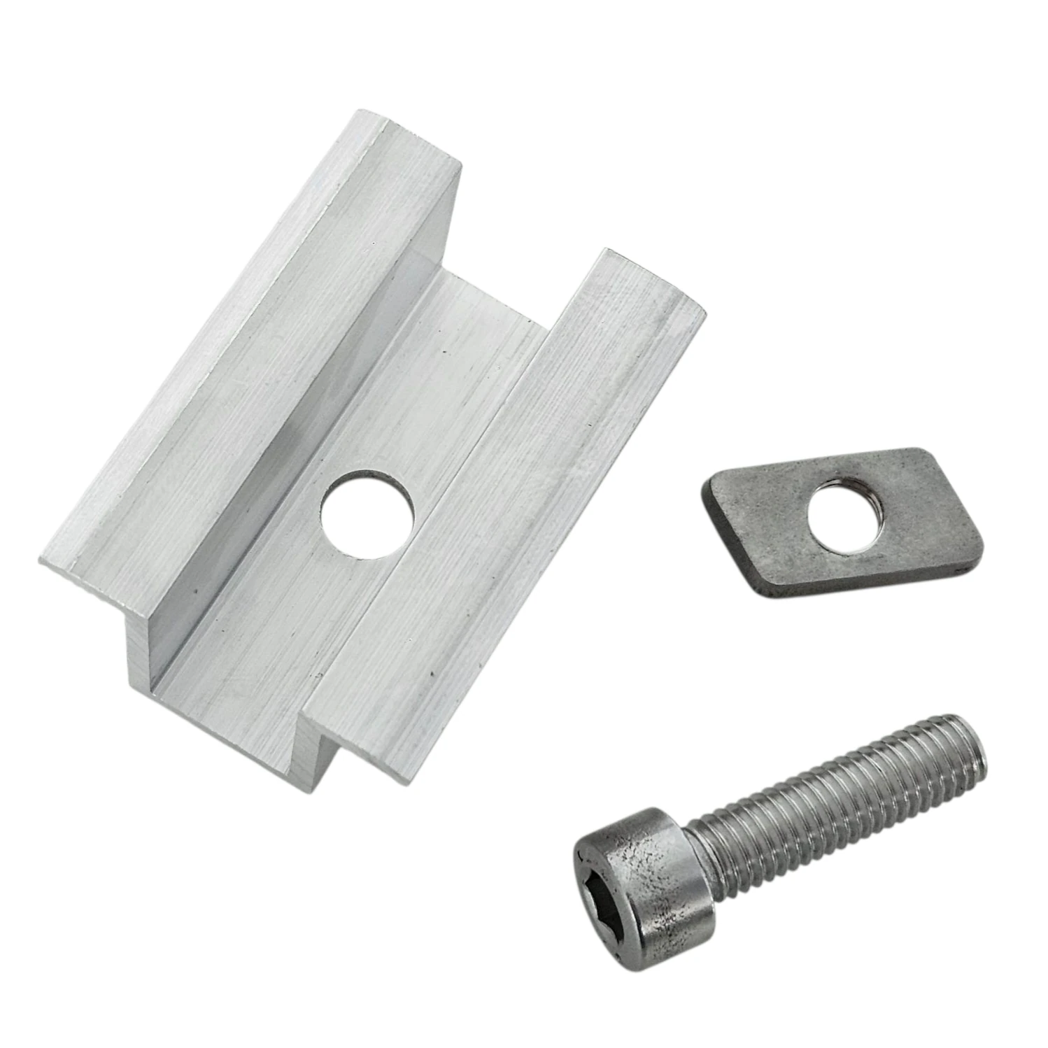 Centrale middenklem H25 L50 met M8x25-schroef en inzetstuk van aluminium 6060, voor de montage van fotovoltaïsche modules van 35 mm met behulp van DIN 912-schroeven.