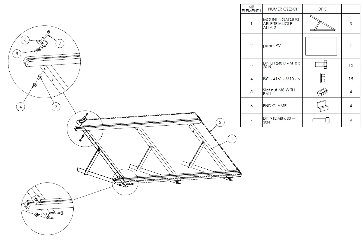 - De driehoeken zijn gemaakt van 40×40×3mm hoekijzer. Het product is gemaakt van 6060 aluminium, wat een lichtgewicht constructie, weerstand tegen mechanische overbelasting en weerstand tegen ongunstige omgevingsomstandigheden garandeert.