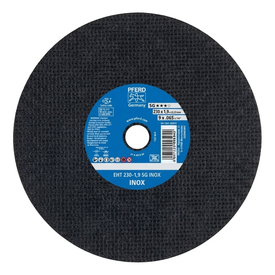 PFERD EHT 230-1,9 SG INOX is een hoogpresterende slijpschijf uit de SG (Performance Line) serie, ontworpen voor het precies snijden van roestvrij staal (INOX) en koolstofstaal. Dankzij de dikte van slechts 1,9 mm zorgt deze voor smal, koel snijden — minimaliseert verhitting van het bewerkte materiaal en beperkt verkleuring, wat cruciaal is bij het werken met roestvrij staal.