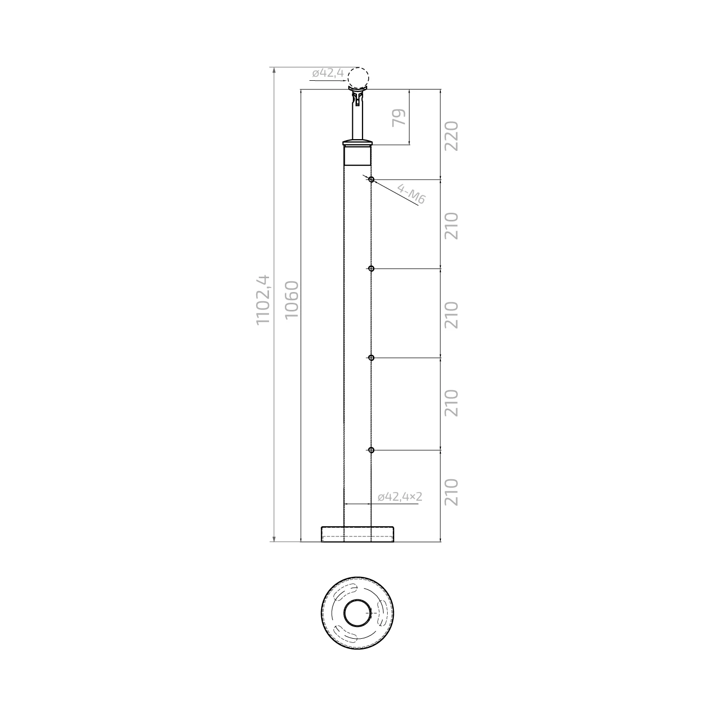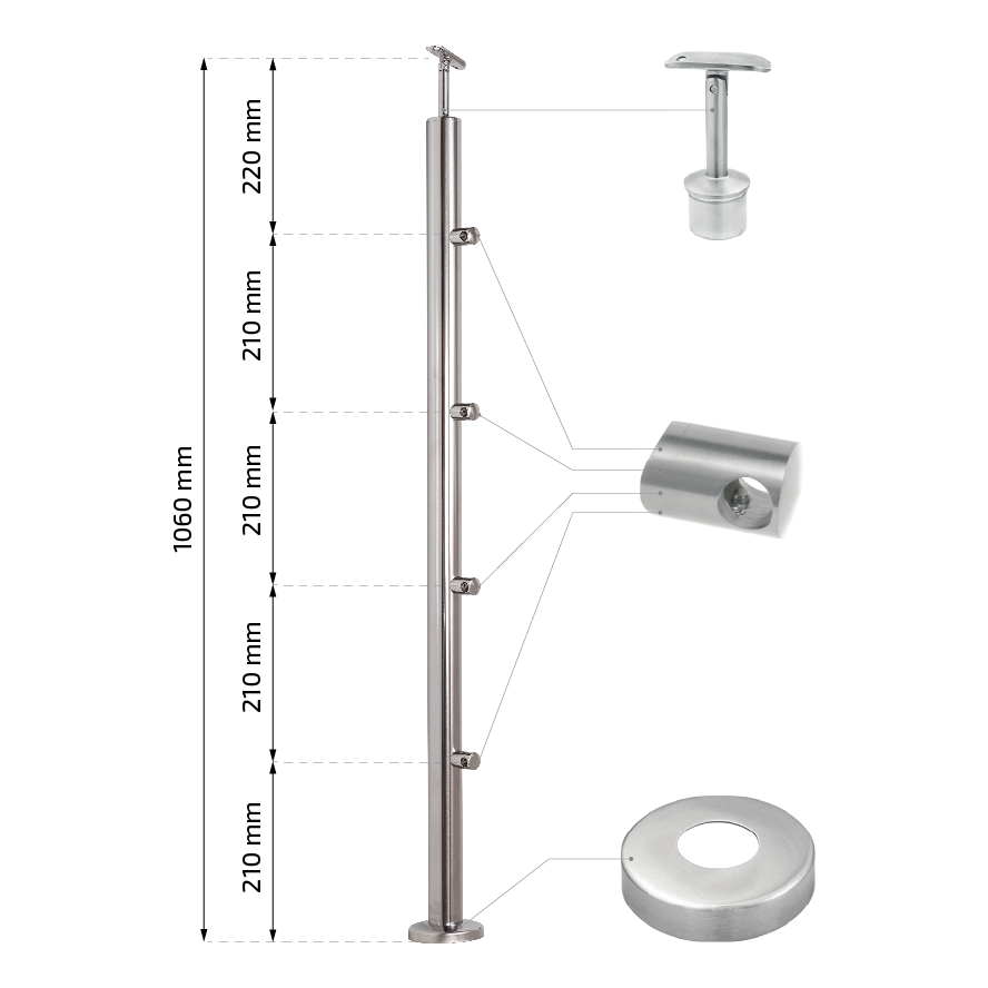 De totale hoogte van de paal met leuning verbinder bedraagt 1102,4 mm, wat in combinatie met een leuning Ø 42,4 mm een ergonomische balustrademhoogte oplevert conform de bouwvoorschriften. De houders zijn gelijkmatig verdeeld om de 210 mm, wat zorgt voor een esthetische verdeling van de vulling.