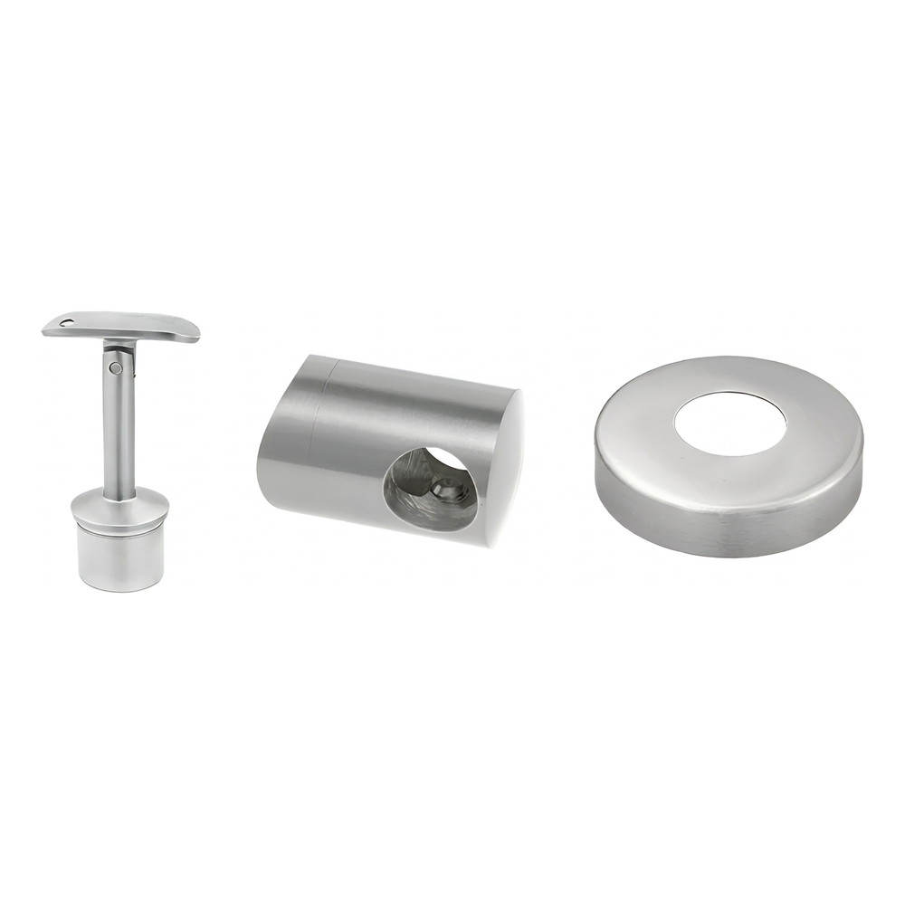 Onderdelen in de set — leuning verbinder, doorlopende staafhouder en basis afdekplaat zijn bij de paal inbegrepen, maar niet permanent bevestigd. Hierdoor kan de installateur vrijelijk de positie en hoek van de elementen aanpassen aan de omstandigheden op de bouwplaats. De fabrikant raadt het gebruik van speciale anaerobe lijm voor roestvrij staal aan om een duurzame en solide verbinding te verkrijgen. Deze montagemanier maakt het ook mogelijk om de paal eventueel in te korten bij vloer oneffenheden.