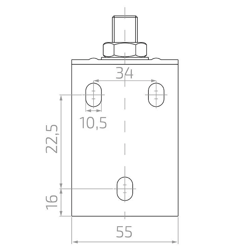 De stalen constructie die gegalvaniseerd is garandeert een hoge weerstand tegen corrosie en jarenlange buitengebruik. De beugel wordt direct op de paal of muur gemonteerd via niervormige gaten in de montageplaat, wat een nauwkeurige verticale positionering mogelijk maakt. Het product is bestemd voor poorten die aan de bovenkant afgewerkt zijn met een gesloten profiel met rechte vorm — zonder uitstekende decoratieve elementen.