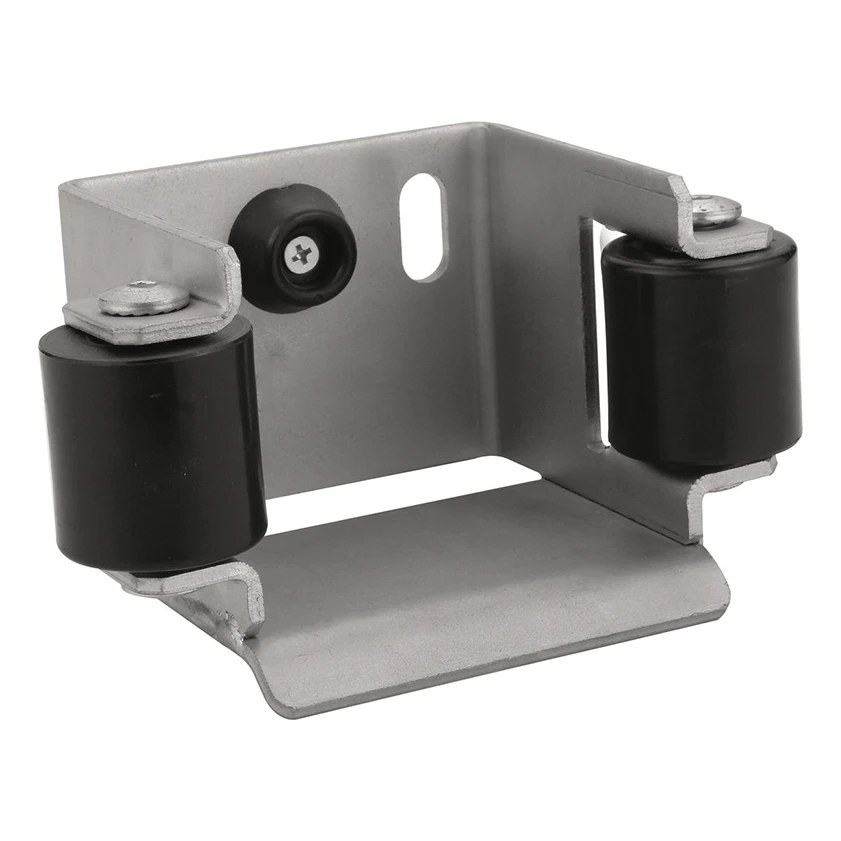 Stalen oprijbeugel geschikt voor rail 80×80 mm. De beugel zorgt voor stabilisatie van de poort na het sluiten en verdeelt het gewicht over meerdere elementen, wat de gebruiksduur van de rijdende wagens aanzienlijk verlengt. Uitgerust met twee kunststof geleidingsrollen en een rubberen stootbuffer aan de achterwand.