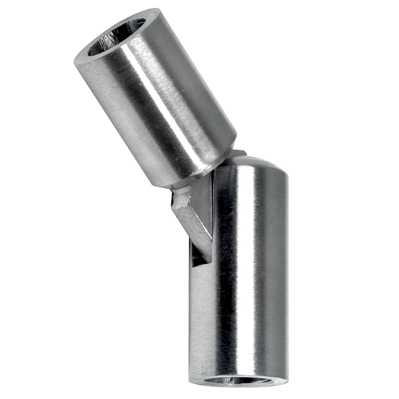 Scharnierende elleboog voor staaf en buis dia 12 mm — universele balusterverbinding van roestvrij staal AISI 304 met satijnafwerking. Dankzij het regelbare hoekbereik van 90°–180° is hij ideaal geschikt voor trappenconstructies, bij knikken en hellingen van leuningen, waar nauwkeurige hoekinstelling vereist is zonder dat elementen moeten worden gesneden of gelast.