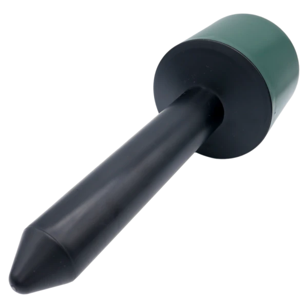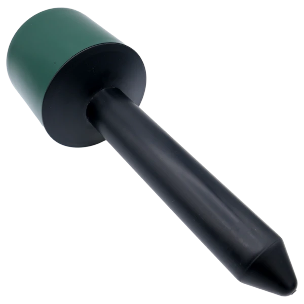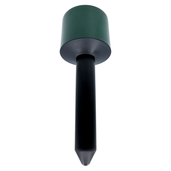 Eenvoudige montage in enkele stappen. Schroef gewoon de kop los, schakel het apparaat in met de POWER-schakelaar, schroef de kop weer vast en draai vervolgens voorzichtig de staaf in de grond. Bij de eerste installatie wordt aanbevolen om met een stok of staaf een verticaal gat in de molshoop te maken. Na montage moet de kop ongeveer 5 cm boven het grondoppervlak uitsteken. Het apparaat werkt ononderbroken totdat het wordt uitgeschakeld of de accu leeg is.