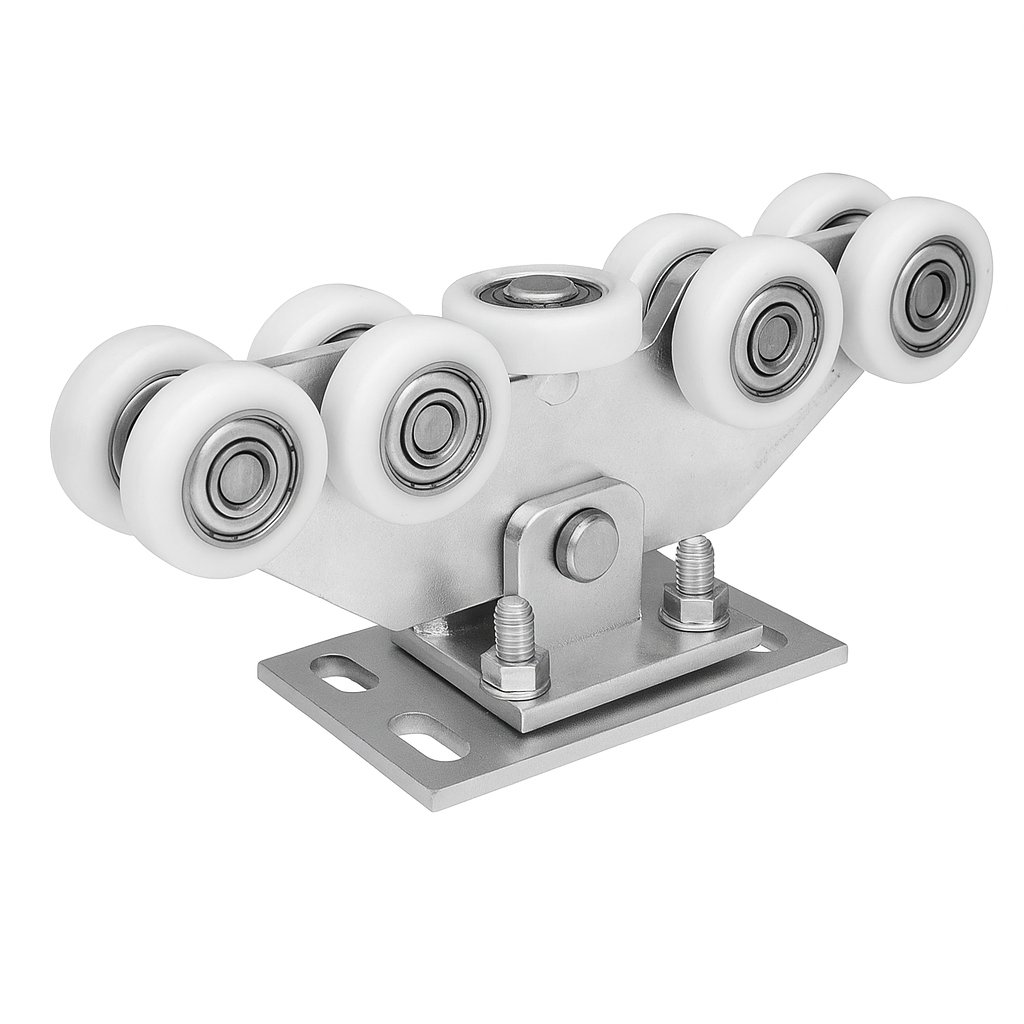 De rijwagen 80 met 9 rollen van kunststof is een betrouwbaar rijonderdeel voor schuifpoorten die worden geleid op een rail van 80×80×5 mm. De constructie met negen rollen zorgt voor een stille en soepele werking van de poort, wat bijzonder belangrijk is bij commerciële objecten en meergezinswoningen. De rollen zijn gemonteerd op kogellagers, wat zorgt voor minimale rolweerstand en een lange levensduur, zelfs bij intensief gebruik.