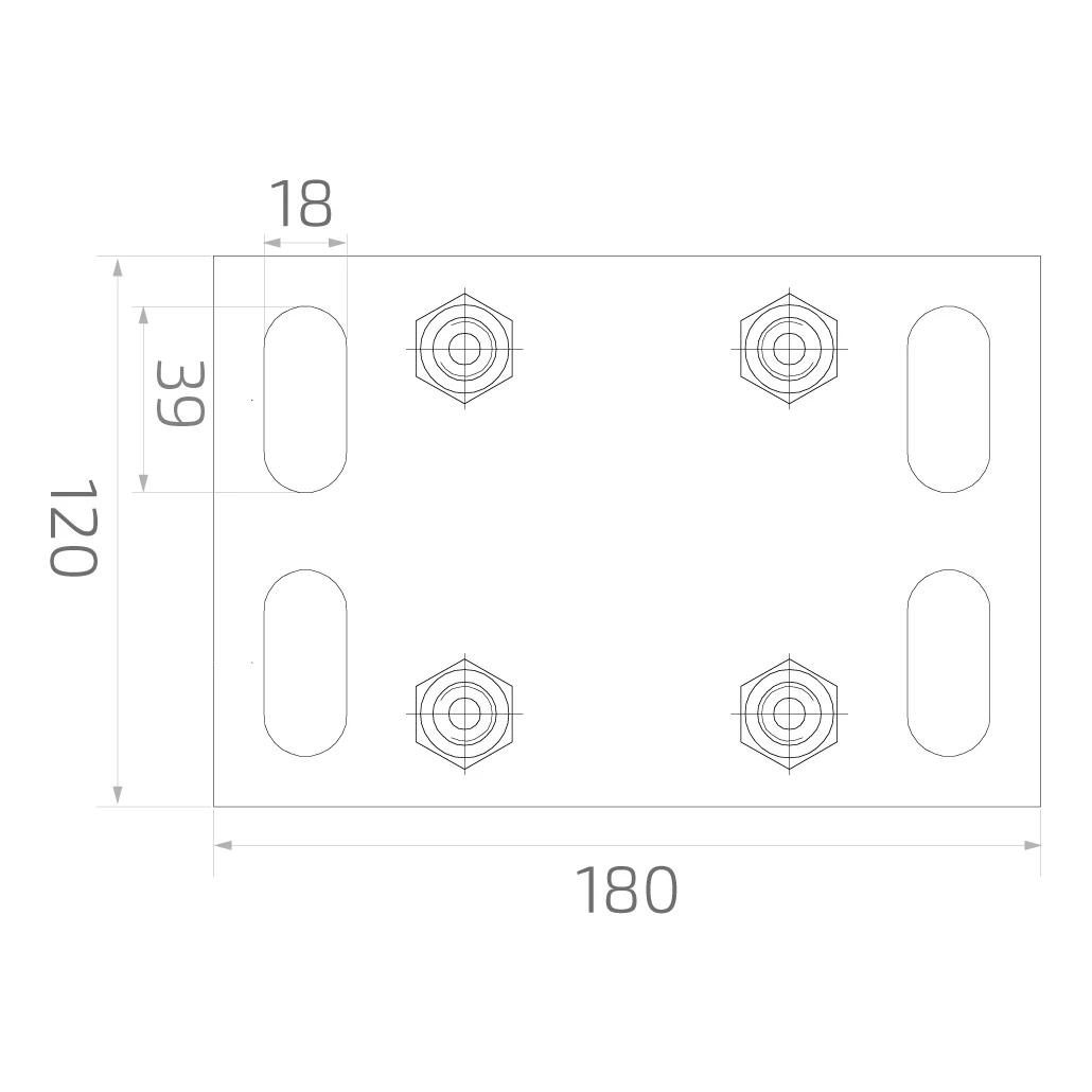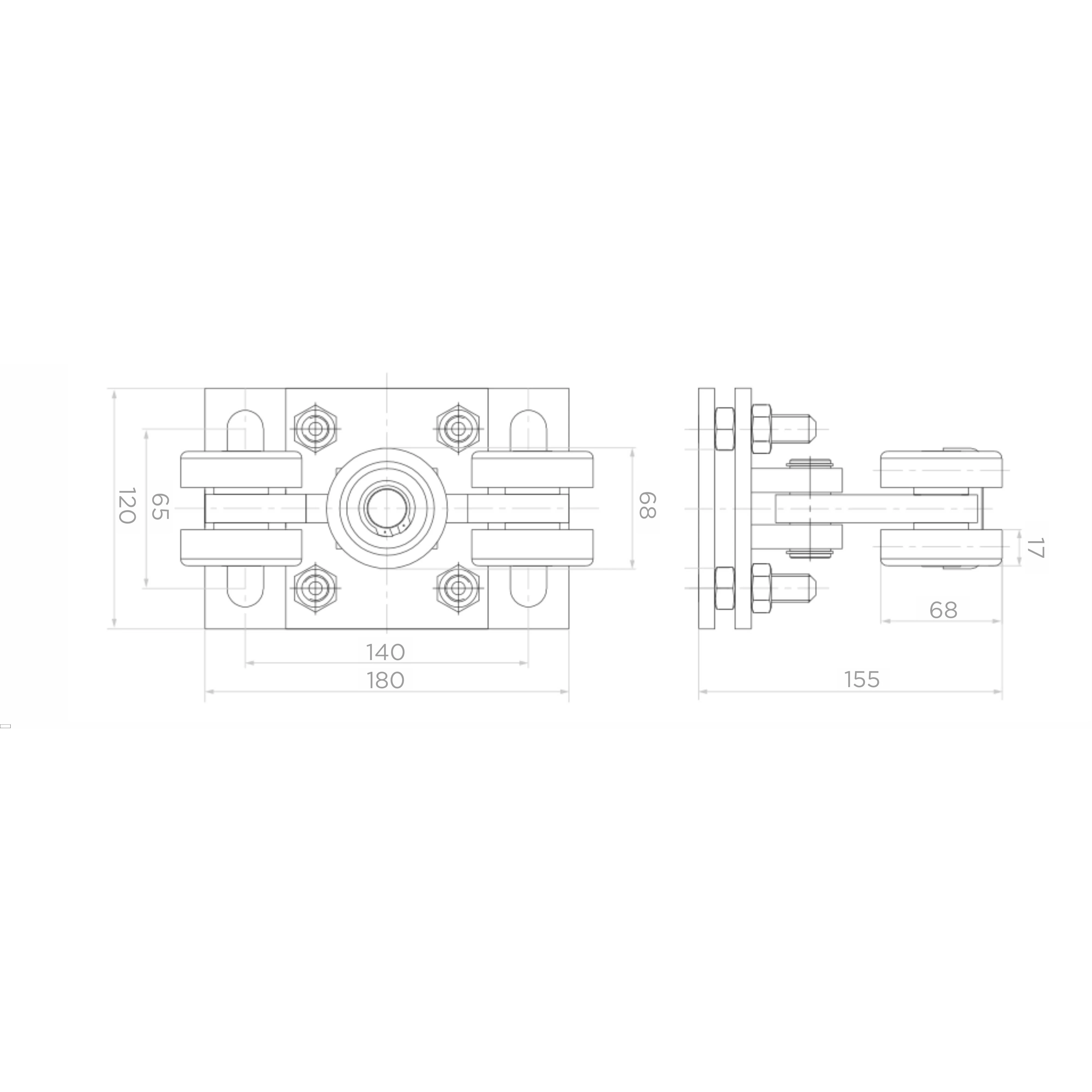 De montagevoet met afmetingen 180×120 mm heeft langwerpige gaten (18×39 mm) die de positieregeling van de rijwagen tijdens bevestiging aan het fundament vergemakkelijken. De rollenafstand bedraagt 140 mm in de lengterichting en 68 mm in de dwarsrichting, en de totale diepte van de rijwagen inclusief rollen is 155 mm.