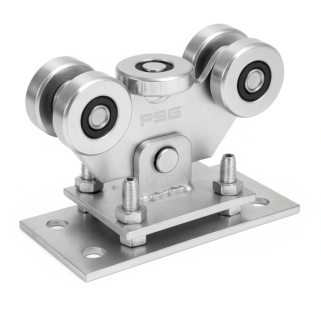 Rijwagen met 5 rollen bestemd voor vrijdragende schuifpoorten. De scharnierende constructie met 5 stalen rollen (waaronder één horizontale rol) zorgt voor een soepele poortgeleiding en automatische aanpassing aan de rijrail. De rijwagen is via een pen verbonden met de voet, wat vrijheid van beweging en compensatie van eventuele railafwijkingen garandeert. De montagehoogte is instelbaar met schroeven, zodat de installateur de poort ter plaatse nauwkeurig kan waterpassen.