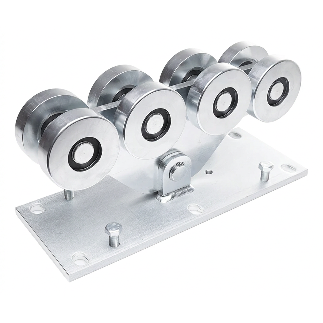 De 8-wiel loopwagen is een robuust aandrijfelement dat speciaal is ontworpen voor zelfdragende railschuifpoorten. Acht stalen wielen op lagers zorgen voor een soepele en stille doorgang van de poort, zelfs bij zware belastingen. De stevige constructie garandeert weerstand tegen mechanische beschadigingen en jarenlange, storingsvrije werking — een oplossing die klachten elimineert en de servicetijd verkort.
