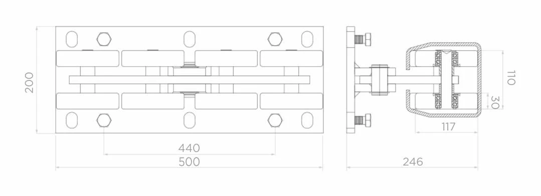 De loopwagen bestaat uit een massieve montageplaat met gaten voor een snelle en betrouwbare bevestiging aan het fundament. Op de plaat zijn 8 loopwielen gemonteerd in twee rijen van vier, wat zorgt voor een gelijkmatige lastenverdeling over de volledige lengte van de geleidingsrail. De wielenopstelling omsluit de rail aan beide zijden — zowel van bovenaf als zijdelings — waardoor de poort stabiel wordt geleid en niet uit de baan springt, zelfs bij hevige wind. De loopwagen is compatibel met geleidingsrail type 6V.140.