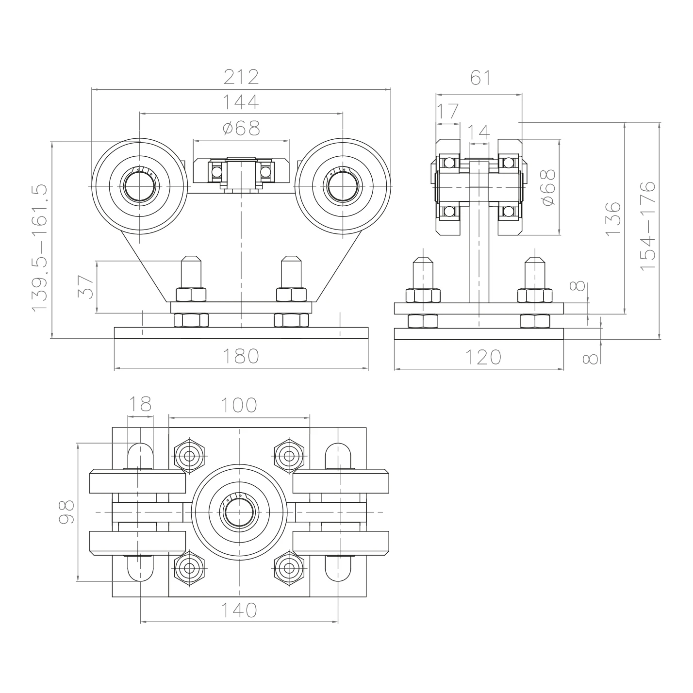 De rijwagen is geschikt voor een rail met afmetingen 80×80×5 mm en wordt vast gemonteerd op de voetplaat. Het ingebouwde mechanisme voor hoogteregeling via schroeven maakt het mogelijk de poort nauwkeurig te waterpassen binnen een bereik van 139,5–161,5 mm (vooraanzicht) en 154–176 mm (zijaanzicht), wat de montage aanzienlijk vereenvoudigt en eventuele oneffenheden in de ondergrond compenseert. Het geheel is voorzien van een zinklaag, wat corrosiebestendigheid en een lange levensduur buitenshuis garandeert.