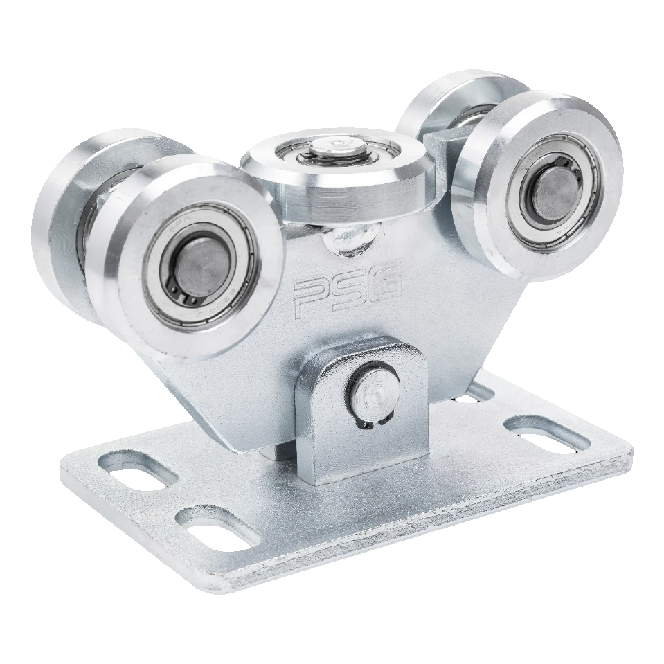 Rijwagen 80 is een robuust, 5-rollig draagelement bestemd voor zelfstandig dragende schuifpoorten. Dankzij de scharnierende constructie past de rijwagen zich automatisch aan de poortgeleider aan, wat zorgt voor een soepele en stille werking zelfs bij zware belastingen. De verbinding met de montagebasis wordt gerealiseerd via een draaistift die eventuele montagefouten en oneffenheden van de rijbaan compenseert.