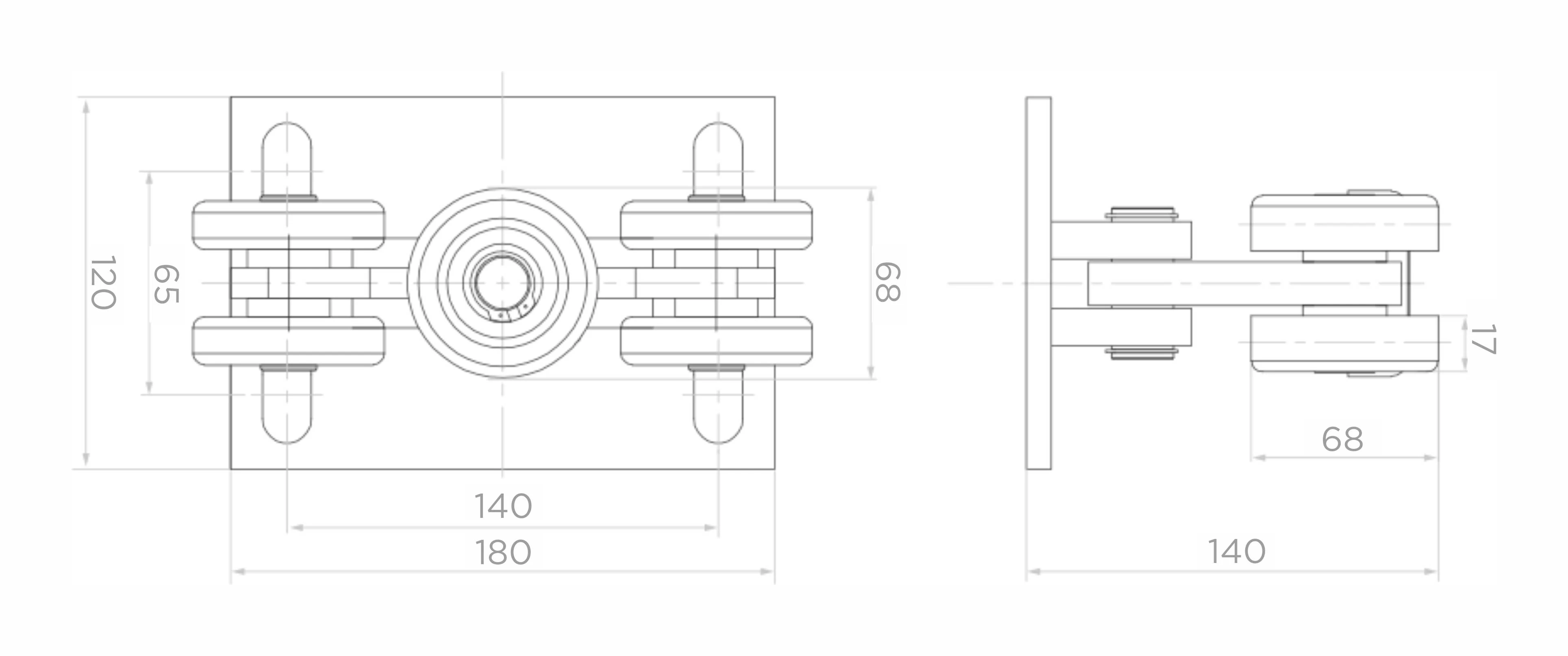 De rijwagen is compatibel met een geleiderail met doorsnede 80 × 80 × 5 mm. De stabiele, massieve basis met langwerpige montagegaten (slotgaten) maakt een nauwkeurige afstelling van de rijwagenpositie op het fundament mogelijk, wat de montage versnelt en het uitlijnen van de rijbaan vereenvoudigt.