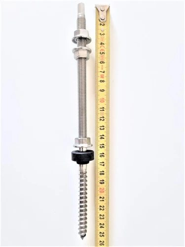 Een van de vele onderdelen die nodig zijn voor de installatie van fotovoltaïsche apparatuur. Het product wordt geïnstalleerd op dakbedekking, metalen platen, dakspanen of vilt. Het element wordt gekenmerkt door twee verschillende draden aan elk uiteinde. Het uiteinde met schroefdraad wordt rechtstreeks op de houten dakstructuur geschroefd. Het andere uiteinde wordt gebruikt om adapters met flensmoeren te bevestigen.