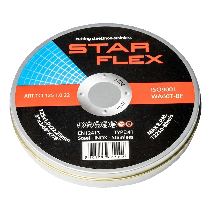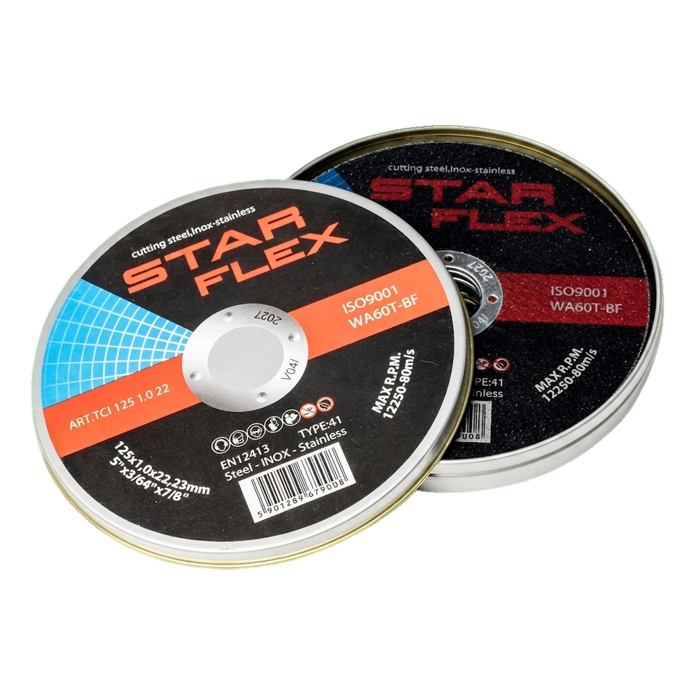 Aanduiding WA60T-BF op Starflex schijven duidt op wit korundschuurmiddel (WA) met korrelgrootte 60, hardheid T (zeer hard) en harsbinding versterkt met vezels (BF). Deze combinatie zorgt voor een optimale balans tussen snijaggressiviteit en schijfduurzaamheid — zelfs bij intensief gebruik op roestvrij staal, dat hoge temperaturen genereert in de snijzone.