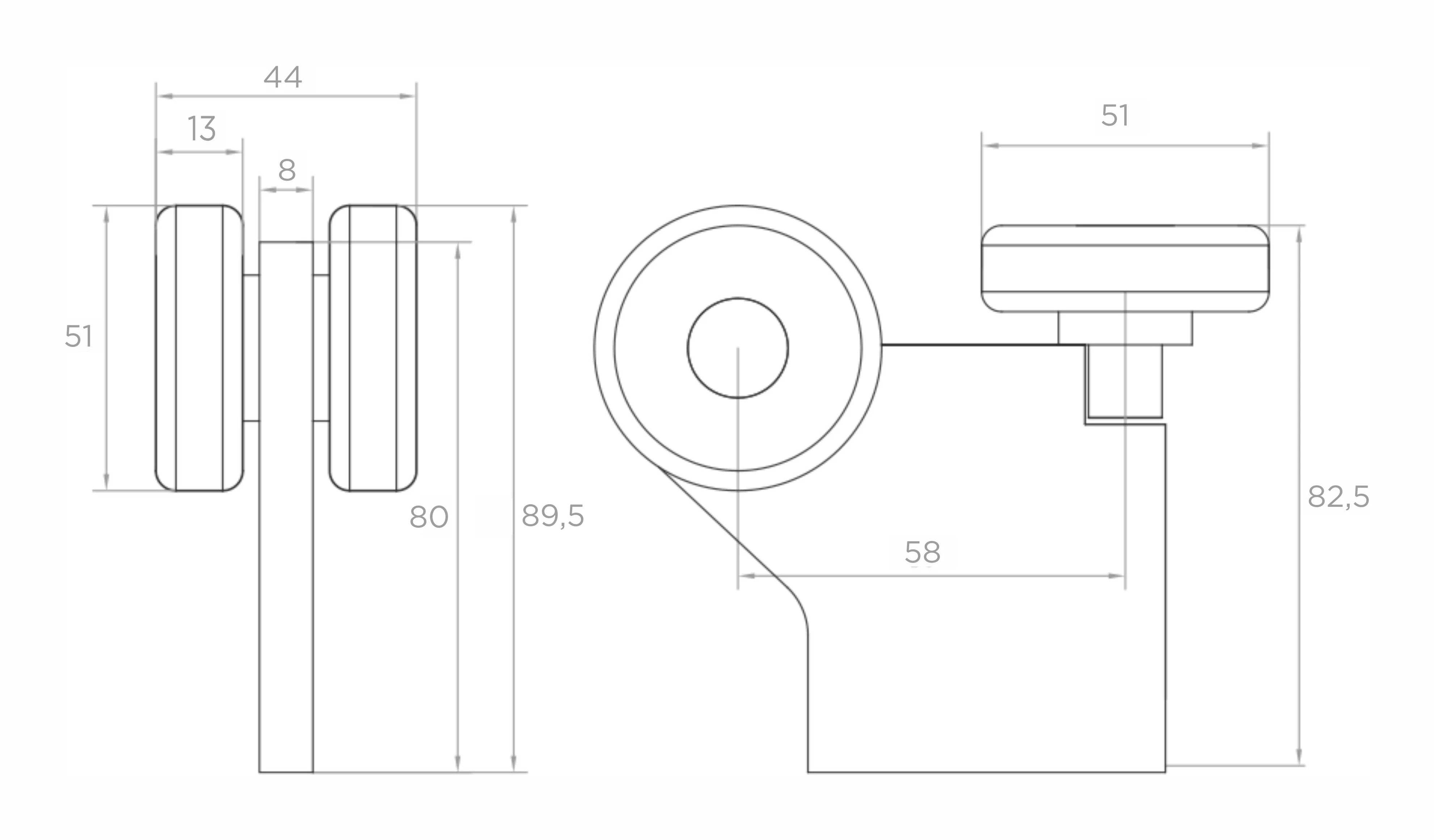 - Hartafstand wielen (draag – geleidingswiel): 58 mm