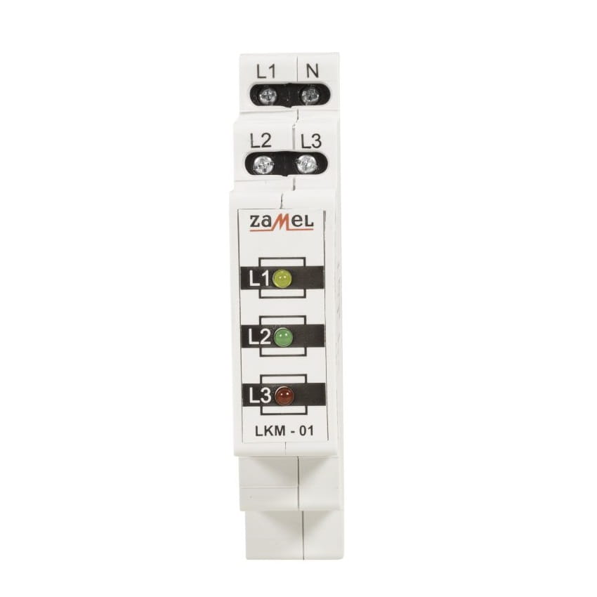 Het heeft drie LED's met een hoge helderheid, gelabeld L1, L2, L3. Een bijkomend voordeel van het model LKM-01-40 is dat het gebruikt kan worden in een driefasig TN-netwerk, d.w.z. een netwerk met een neutrale N-geleider. De eenheid wordt gemonteerd op een TH 35-rail en kan dus worden aangepast aan niet-standaard toepassingen. De behuizing uit één module en de duurzame lichtgevende elementen garanderen een lange en betrouwbare werking van de indicator.